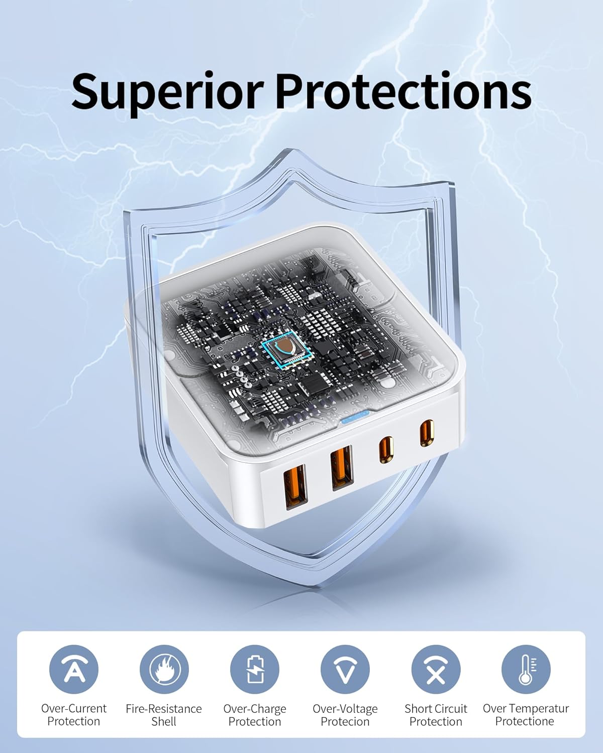 Safety Certification – our multi-device charger is ETL CE FCC PSE RoHS certified, the type c chargerblock has built-in smart lC, can provide over-current protection, over-voltage protection, over-heatprotection and short-circuit protection for all charging devices, The USB C wall plug is made of ABS freproof material, ensuring that your electronic devices are always safely charged