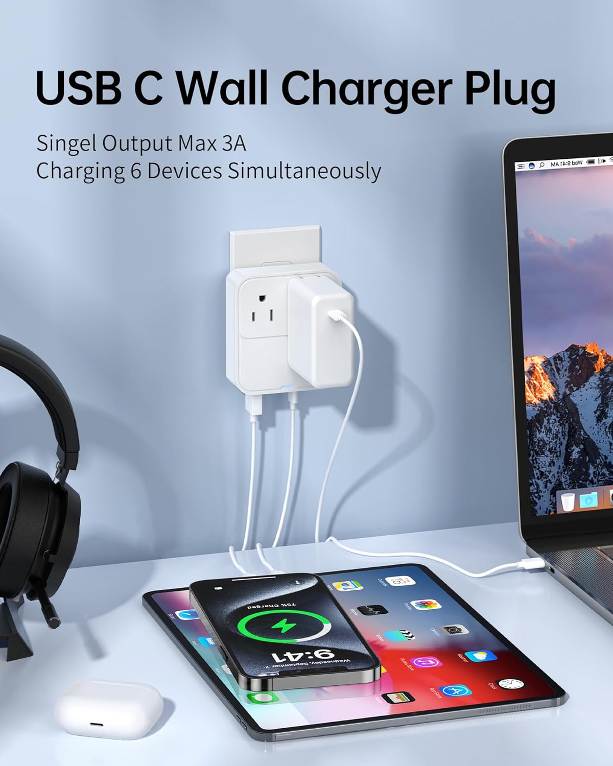 Multi USB Adapter Plug – VPSUN usb c charger block with outlet extender conveniently charges 6 devices at once and provides optimal charging speed up to 4A , the maximum output of a single USB C port is 4A,USB A port is 2.4A; the indicator light lets you know the USB wall plug power is on/off, perfect for office, home, travel us