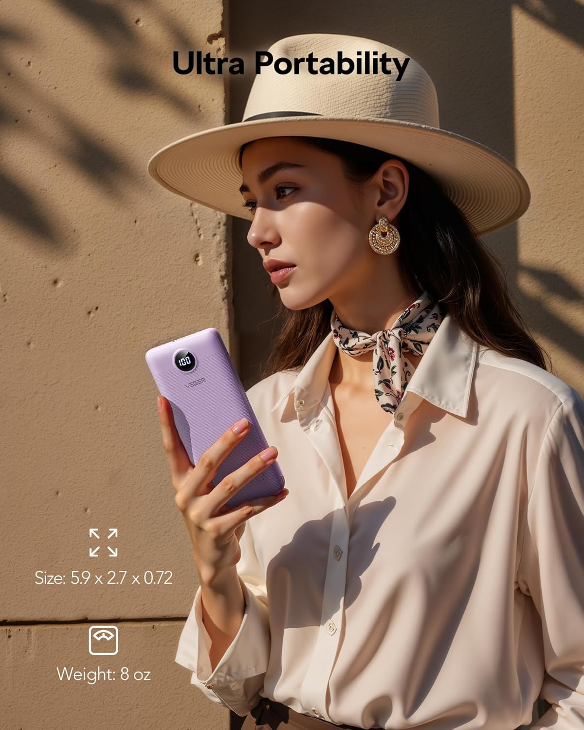 Powerful but Ultra-Portable: 10,000mAh in a Slim Design. Engineered with a remarkably slim and light body (only 0.72” thin and 8 oz), this charger packs a massive 10,000mAh capacity, which avaliavle for carrying on the plane. Get up to 1.8 full charges for your iPhone 17, 1.6 for your Samsung S25, a full charge for your iPad Mini, and 40 charges for your AirPods. Experience heavyweight power that fits perfectly in your pocket or bag for all-day use.