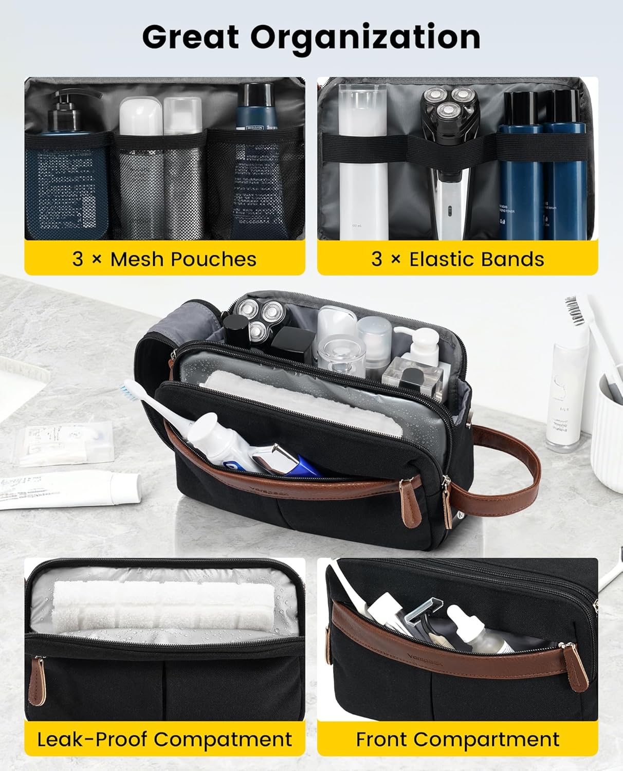 Wide Opening & Handy Carry: This travel toiletry bag for men has a smooth dual-zipper that opens wider, offering clear visibility and quick access to all your items. A reinforced leather handle makes it easy to carry on the go or hang in the bathroom