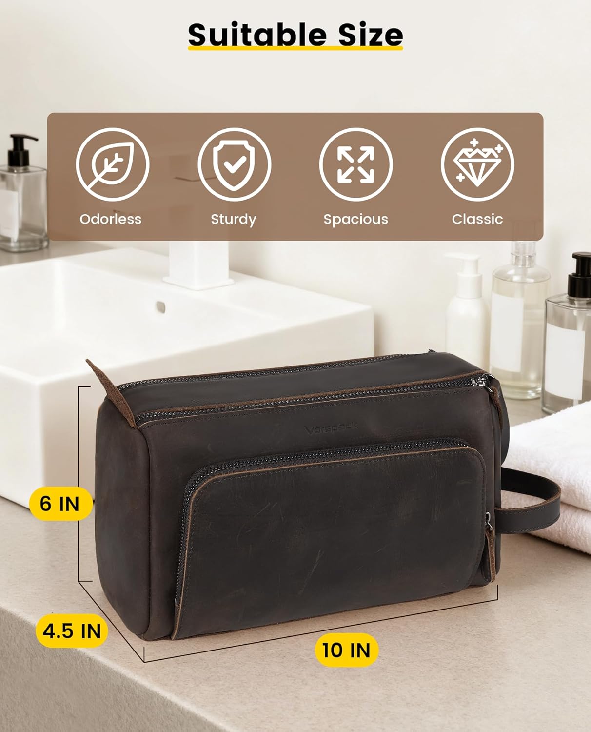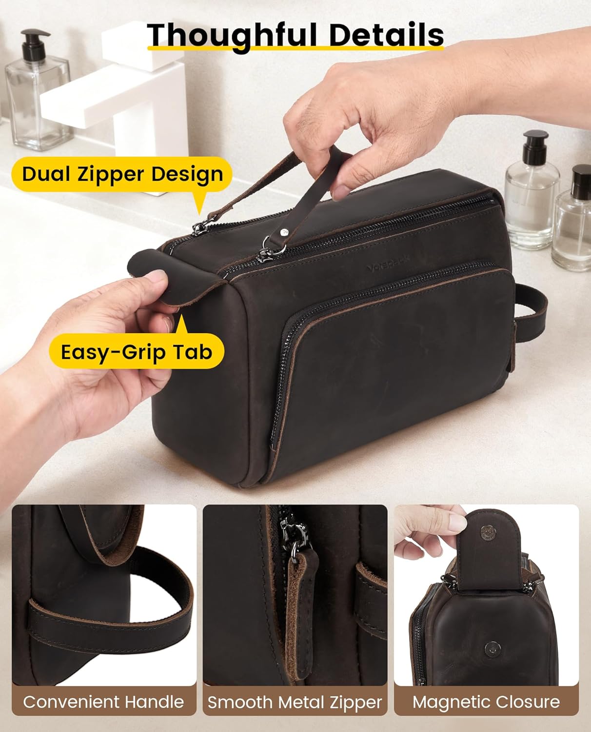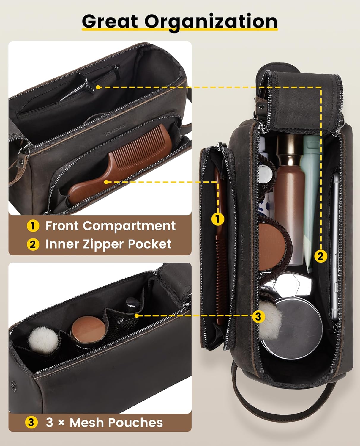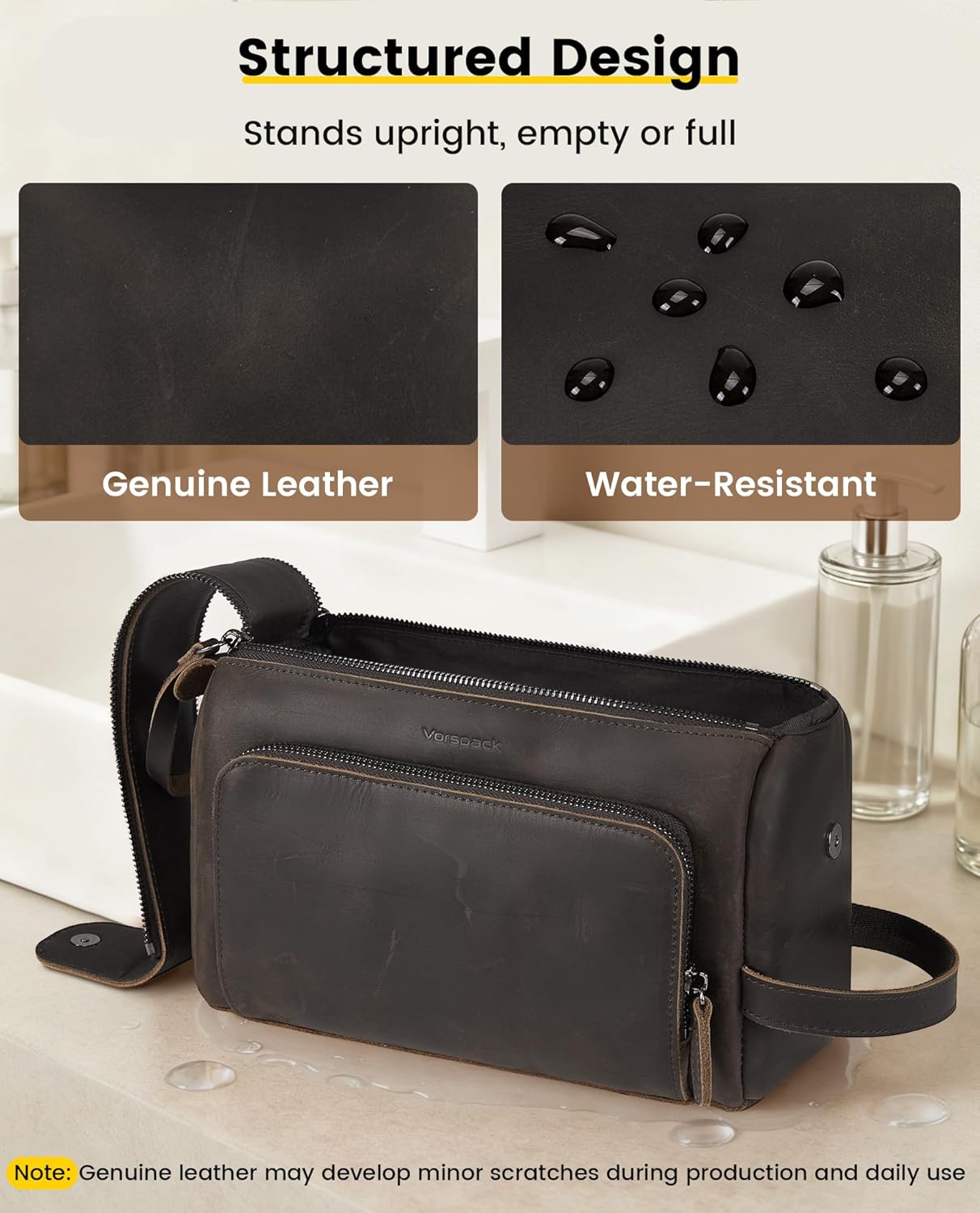 Quality Materials: Crafted from genuine leather, this toiletry bag for men offers a soft, comfortable feel without any order. It’s both sturdy and pleasant to touch, while the water-resistant surface shrugs off accidental splashes, keeping your gear dry inside